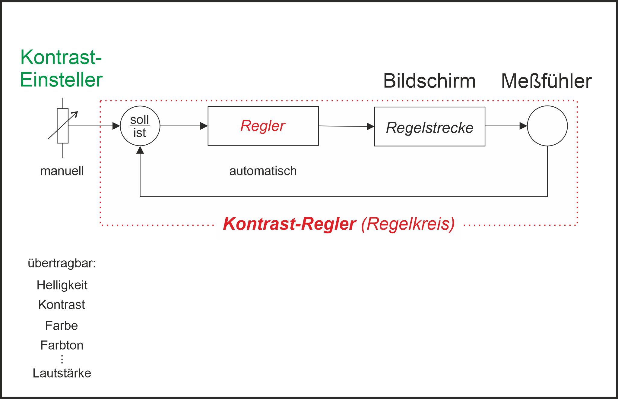 Die Funktion eines Kontrasteinstellers (Schiebe- oder Drehpotentiometer) gibt durch Erhöhen oder Verringern des Kontrastes einen bestimmten Wert vor und ist eine rein manuelle Funktion.